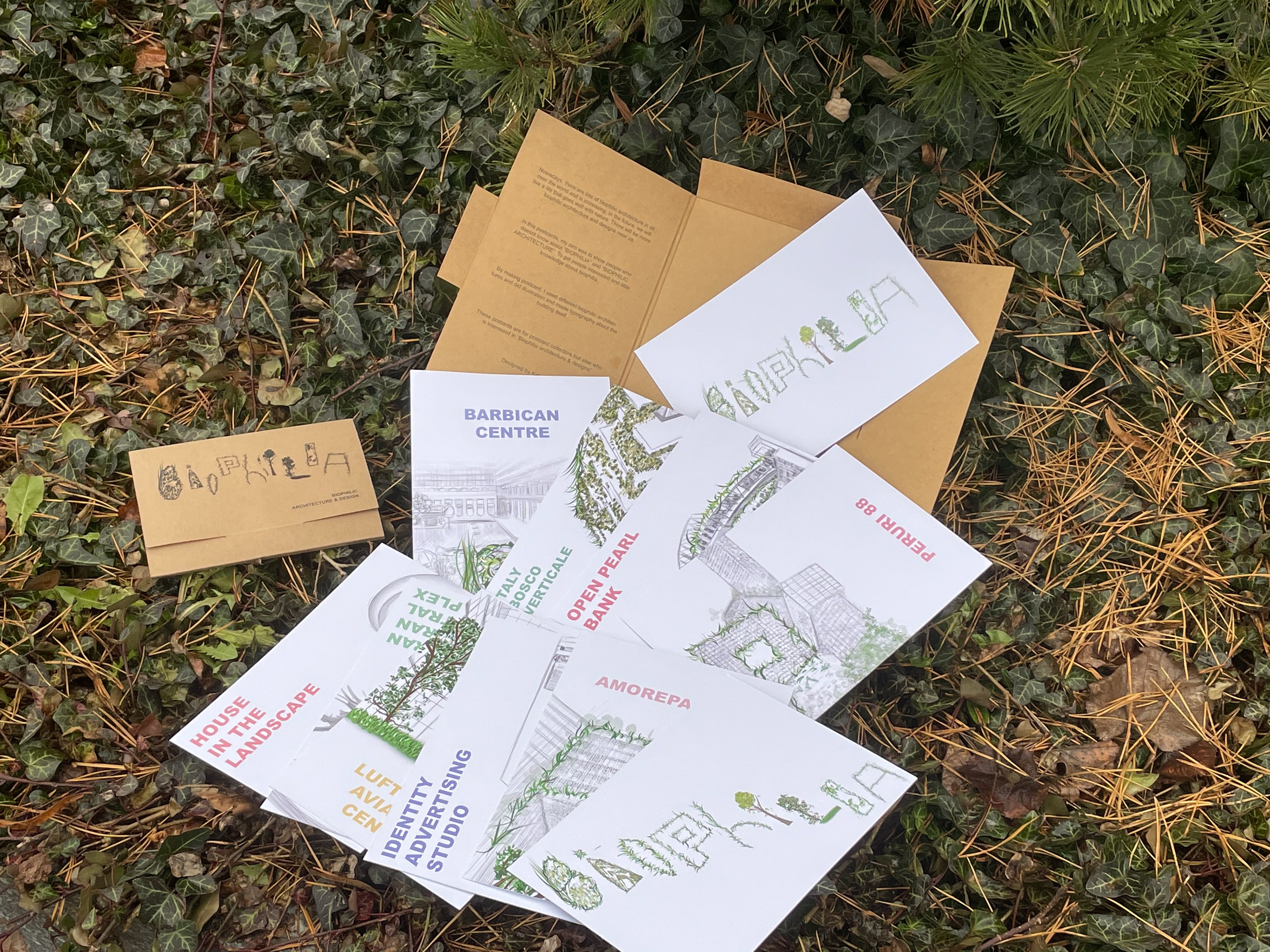 In this postcards, my aim was to show people who doesn't know about “BIOPHILIA” and “BIOPHILIC ARCHITECTURE”. To get people interested and little knowledge about biophilia.