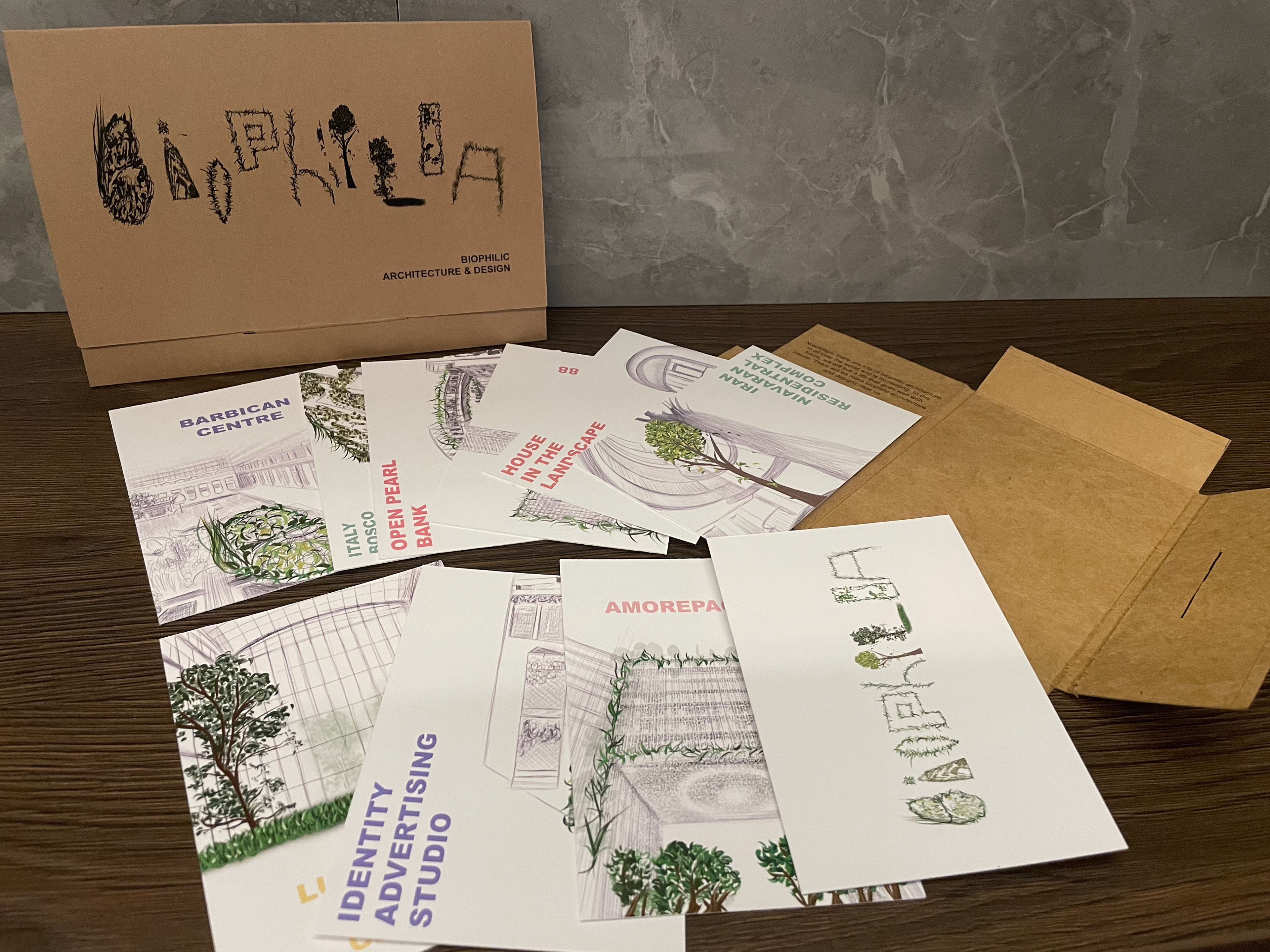 By making postcard, I used different biophilic architectures and did illustration and made typography about the building itself.